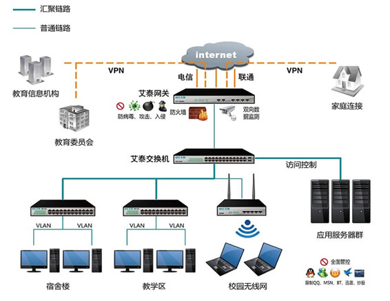 "科教興國"是保證我國能夠長期、穩(wěn)定、高速發(fā)展的戰(zhàn)略國策,教育信息化是達(dá)成該戰(zhàn)略國策的重要手段之一,因此教育信息化工作受到了國家各級(jí)教育主管部門的高度重視。但是實(shí)際情況是經(jīng)費(fèi)朝大學(xué)傾斜,因此,如何利用比較少的資源實(shí)現(xiàn)中小學(xué)的信息化,這是我們關(guān)注的重點(diǎn),況且,中小學(xué)作為基礎(chǔ)教育的階段,更是需要普及信息化。網(wǎng)絡(luò)給教育帶來的好處不言而喻。艾泰科技提供一套安全、穩(wěn)定、“綠色”的網(wǎng)絡(luò)解決方案。