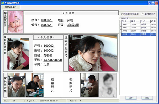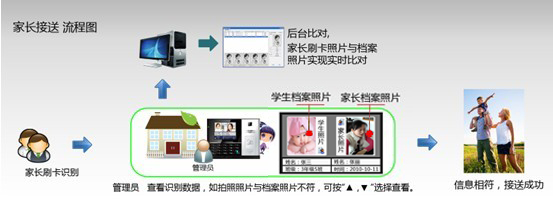 家長(zhǎng)接送: 設(shè)備安裝于門衛(wèi)室旁,家長(zhǎng)進(jìn)門時(shí),首先進(jìn)行刷卡,家長(zhǎng)刷卡以后,管理員現(xiàn)場(chǎng)查看刷卡信息,比對(duì)照片,如與檔案照片不符(因小孩可能對(duì)應(yīng)多位家長(zhǎng)接送),則按“↑”與“↓”鍵,查看所屬其他家長(zhǎng)照片,查到該家長(zhǎng)照片則完成接送。 后臺(tái)管理員可實(shí)時(shí)查看刷卡數(shù)據(jù),實(shí)現(xiàn)實(shí)時(shí)查看。