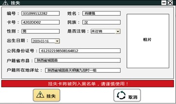 點(diǎn)擊“掛失”項(xiàng),會(huì)顯示該人員檔案信息,確認(rèn)無誤以后,點(diǎn)擊“掛失”項(xiàng),系統(tǒng)會(huì)把該人員列入黑名單