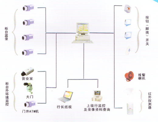 可選配移動檢測報警、探測器報警、網(wǎng)絡監(jiān)控和云臺鏡頭控制等功能,將銀行保安監(jiān)控、中心監(jiān)控、分控和柜員制監(jiān)控合而為一,組成完整的大型網(wǎng)絡化綜合性監(jiān)控系統(tǒng)。