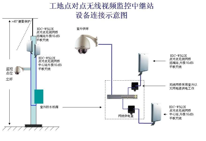 為保證某項(xiàng)目工程安全順利進(jìn)行,公司管理人員能夠及時(shí)了解施工現(xiàn)場(chǎng)情況和施工進(jìn)度,在工程現(xiàn)場(chǎng)安裝了合肥環(huán)宇智能工程有限公司的5.8GHz室外點(diǎn)對(duì)點(diǎn)、點(diǎn)對(duì)多點(diǎn)無(wú)線(xiàn)視頻監(jiān)控系統(tǒng),該系統(tǒng)由合肥監(jiān)控公司環(huán)宇智能的點(diǎn)對(duì)點(diǎn)、點(diǎn)對(duì)多點(diǎn)無(wú)線(xiàn)網(wǎng)橋和200W網(wǎng)絡(luò)高速球組成。